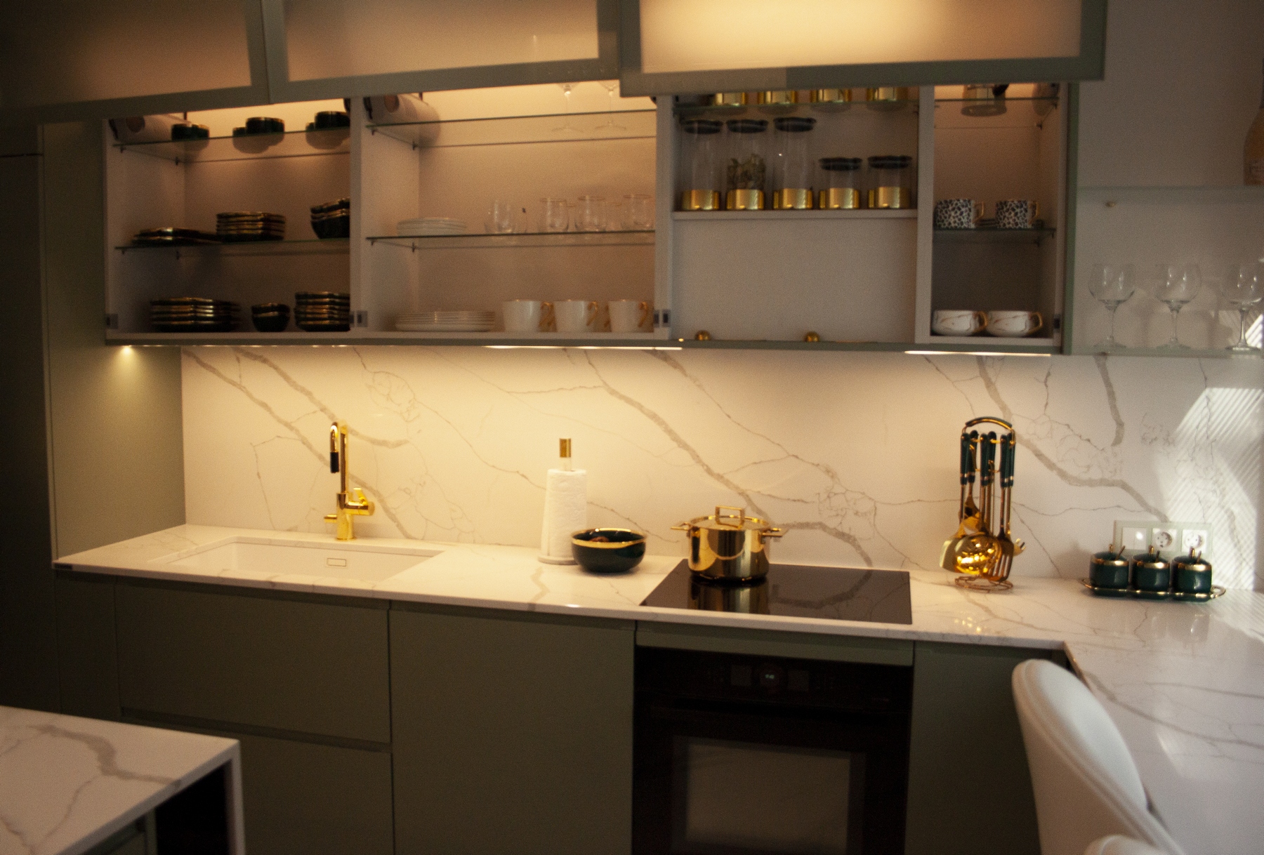 Arbetsytor av Crystal Calacatta Silva-kvartssten i perfektionistens kök