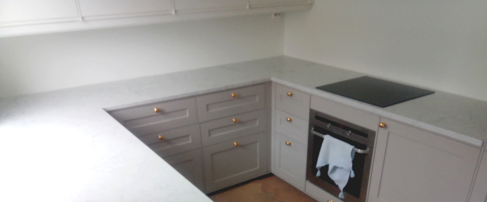 Da fikk vi benkeplate montert, den var veldig fin og veldige flinke montører. Det gikk heldigvis fint å montere koketoppen også. Vi er veldig fornøyd med benkeplaten.