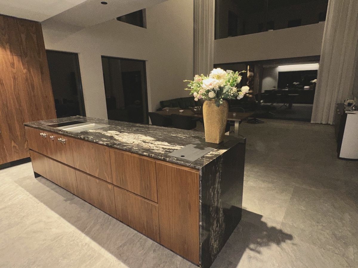 Cosmic Black är svart brasiliansk granit med mörk bakgrund, vita linjer och brunröda fläckar.