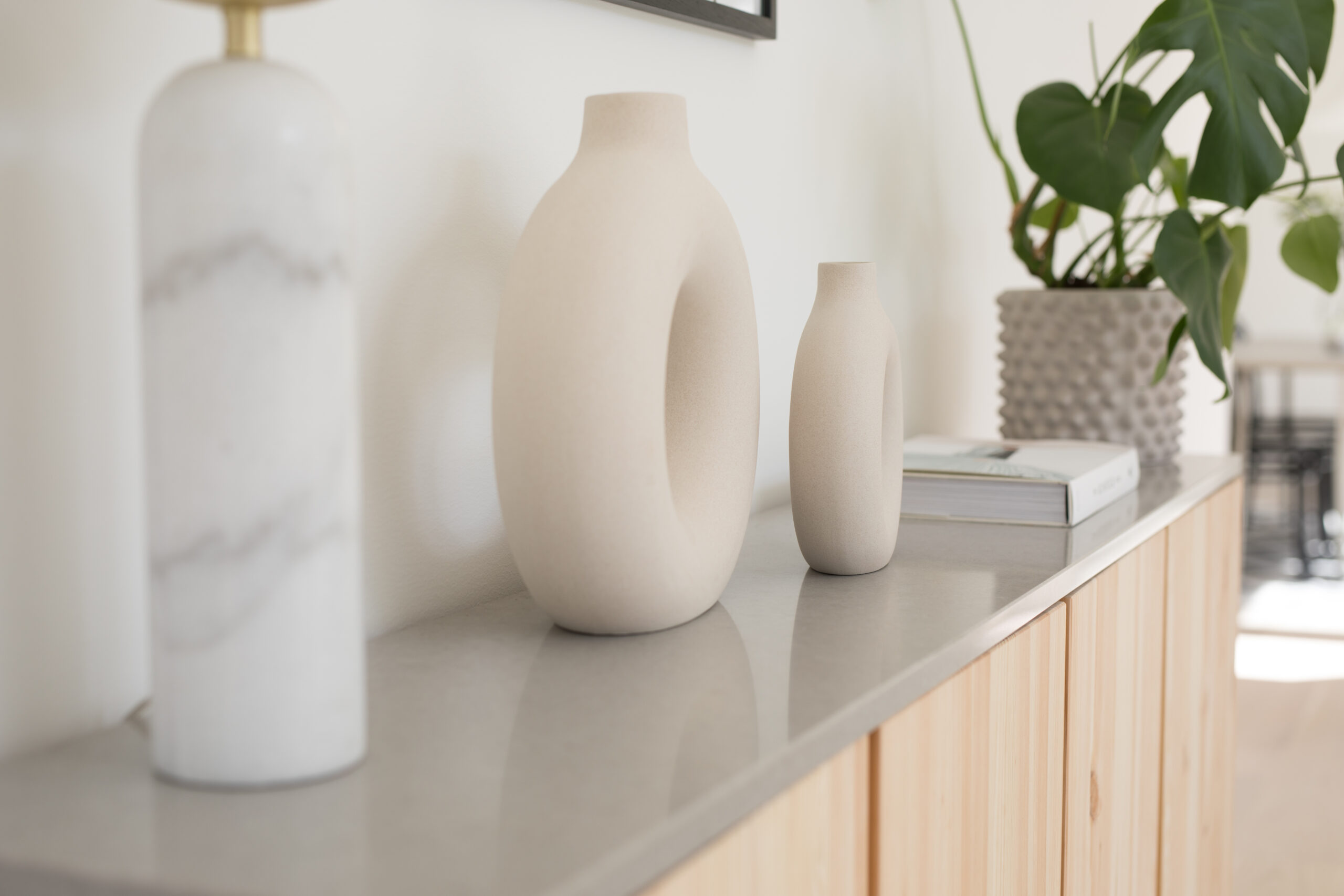 Noble Concrete Grey är kalkstensliknande kompositsten i betonggrå färg. Kompositstenskivor i Noble Concrete Grey material är starka, hållbara och extremt hygienisk! Den grå färgen ger köket en modern och lugn bakgrund och förhöjer alla andra föremåls djärvare färger.