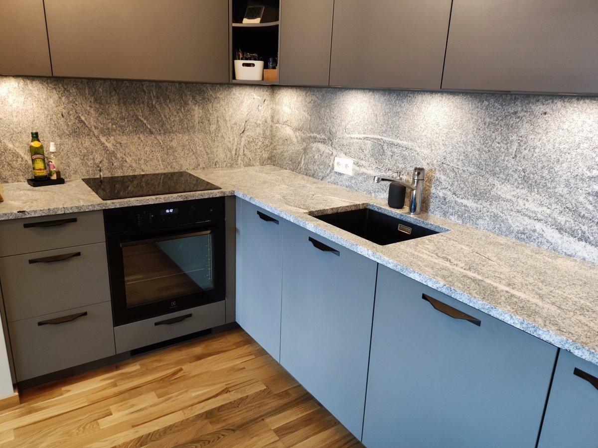 Vi valde en stänkskiva, så att det skulle bli så få skarvar som möjligt – en matt möbel, matta svarta dörrhandtag, slipad, men inte polerad granit. Plattsättning på vägg eller en blänkande blank yta skulle i detta sammanhang verka främmande. Ett enhetligt och minimalistiskt kök skulle vara vackrare.
