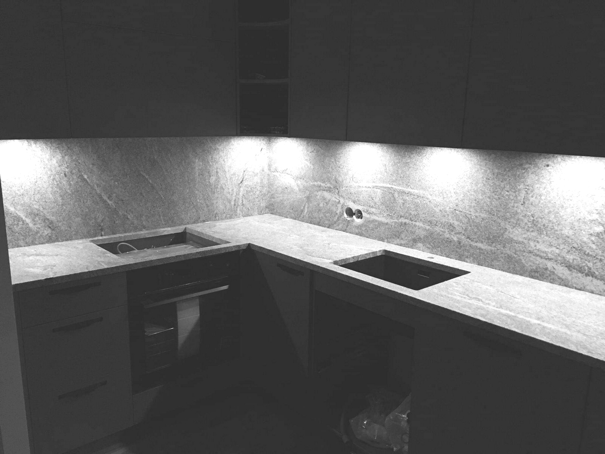 Det har redan gått tre år. Vi har inte gjort något särskilt. Vi har helt enkelt hållit ytan ren. Man har sagt att Viscount White jämfört med hårda graniter skulle vara porösare och att den skulle vara särskilt känslig med en slipad yta. Matfett som stänker vid stekning och mycket annat skulle absorberas av stenen…